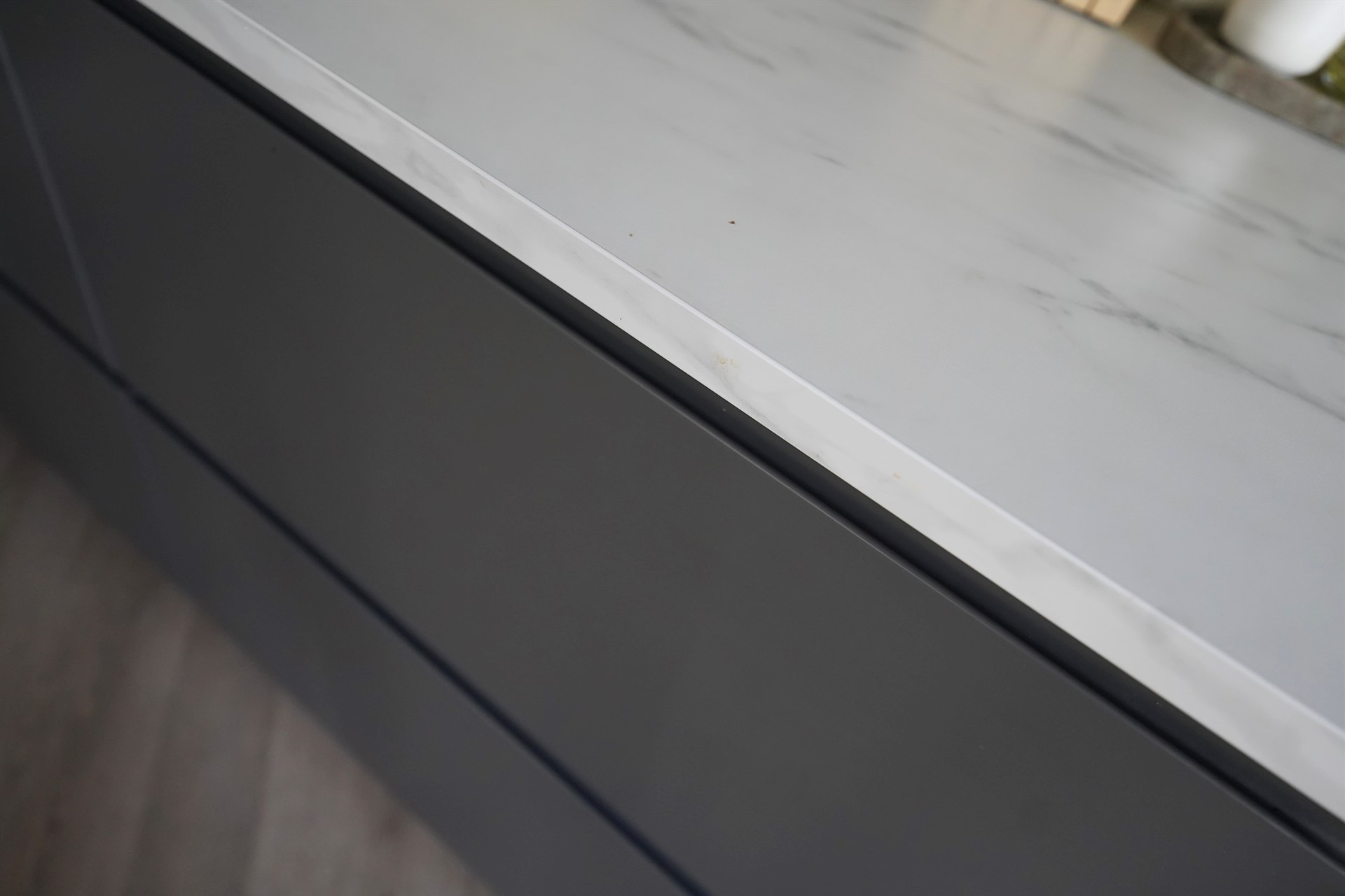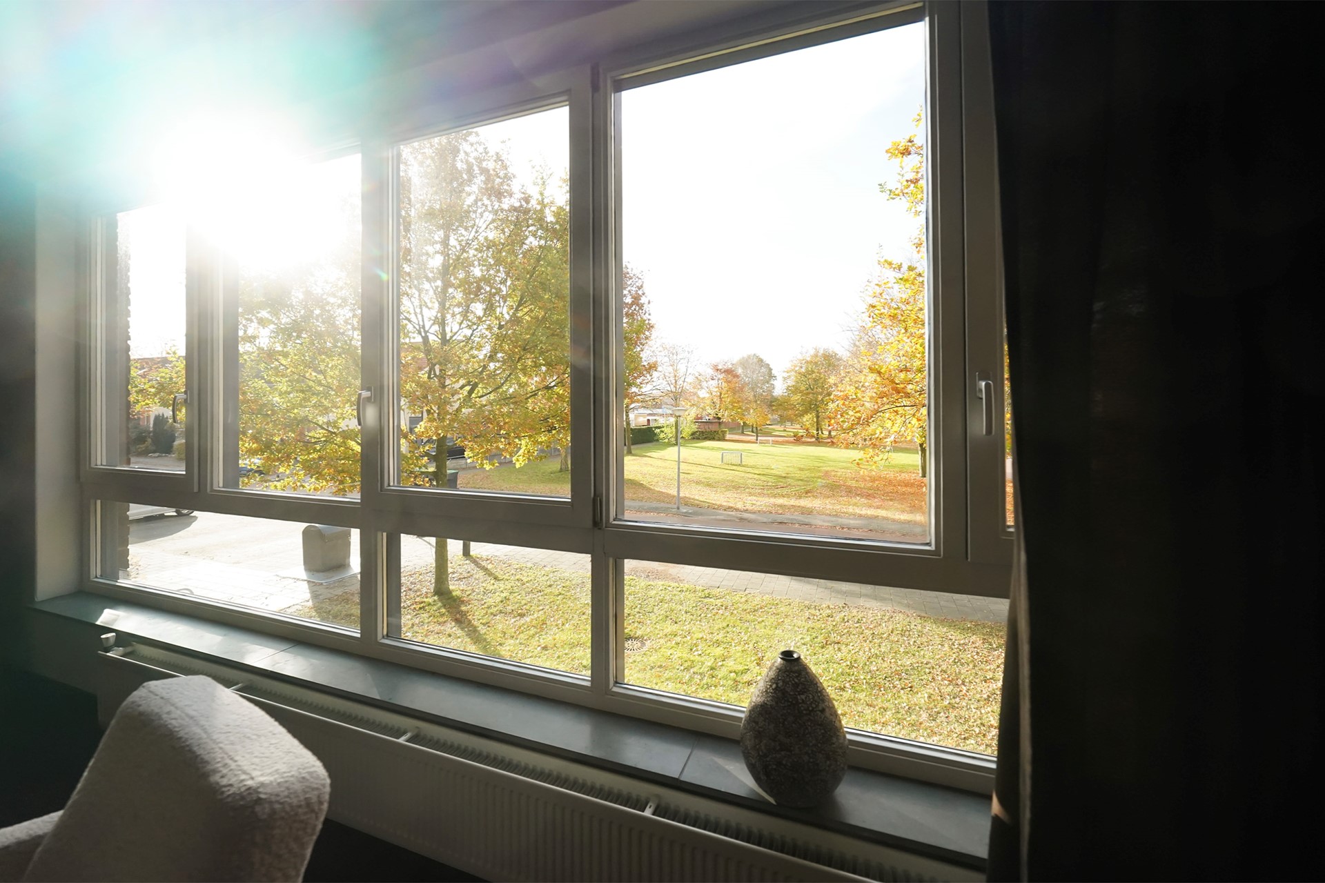 Ik loop meteen richting de woonkamer een de keuken en de ruimte verrast me. Door de grote raampartijen en zelfs nog een lang hoekraam is dit een heerlijke lichte een ruime leefruimte. Deze ruimte voelt als een penthouse. Je kijkt over een uitgestrekt groen plantsoen uit waar je de seizoenen perfect kunt beleven. De keuken is extra groot door de extra m2 die normaal als loggia was ingericht en waar je gemiddeld gezien heel weinig gebruik van maakt toch? Nu is er een heerlijke grote hoekkeuken in 2025 gerealiseerd! Slim! In het lounge-gedeelte kan een fijne grote zitopstelling staan zoals je ook wel op de foto’s kan zien.