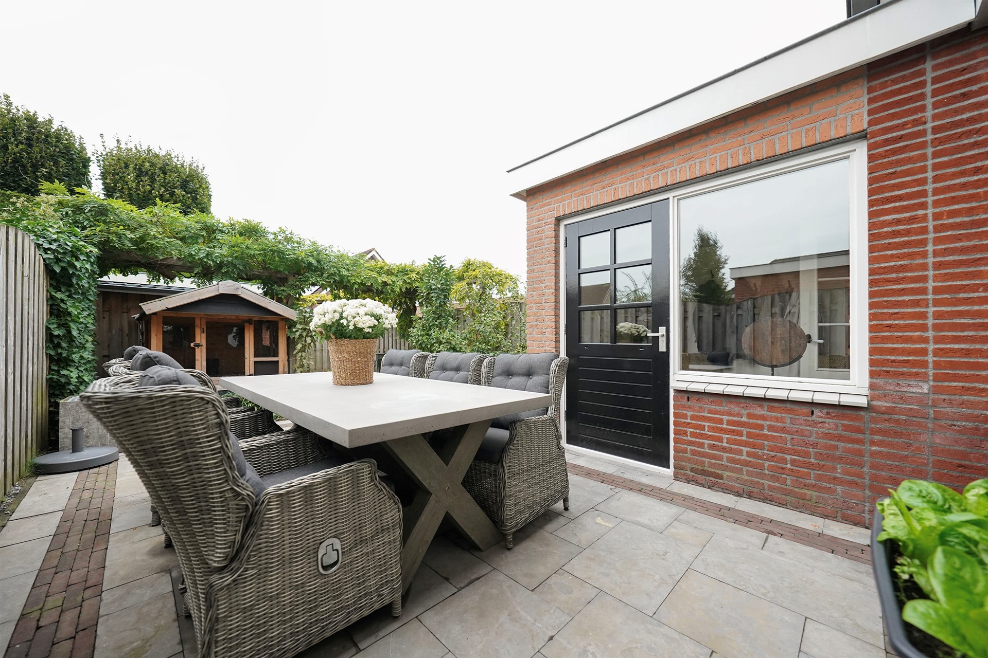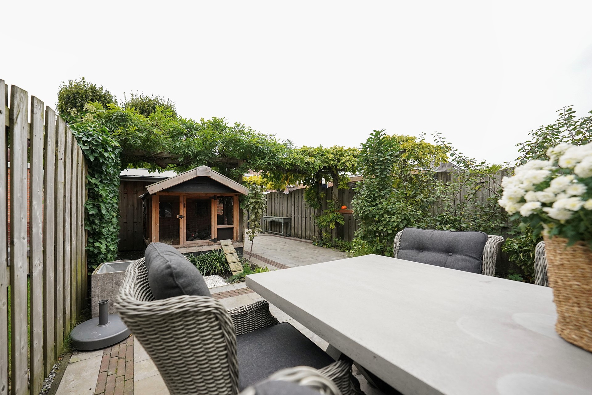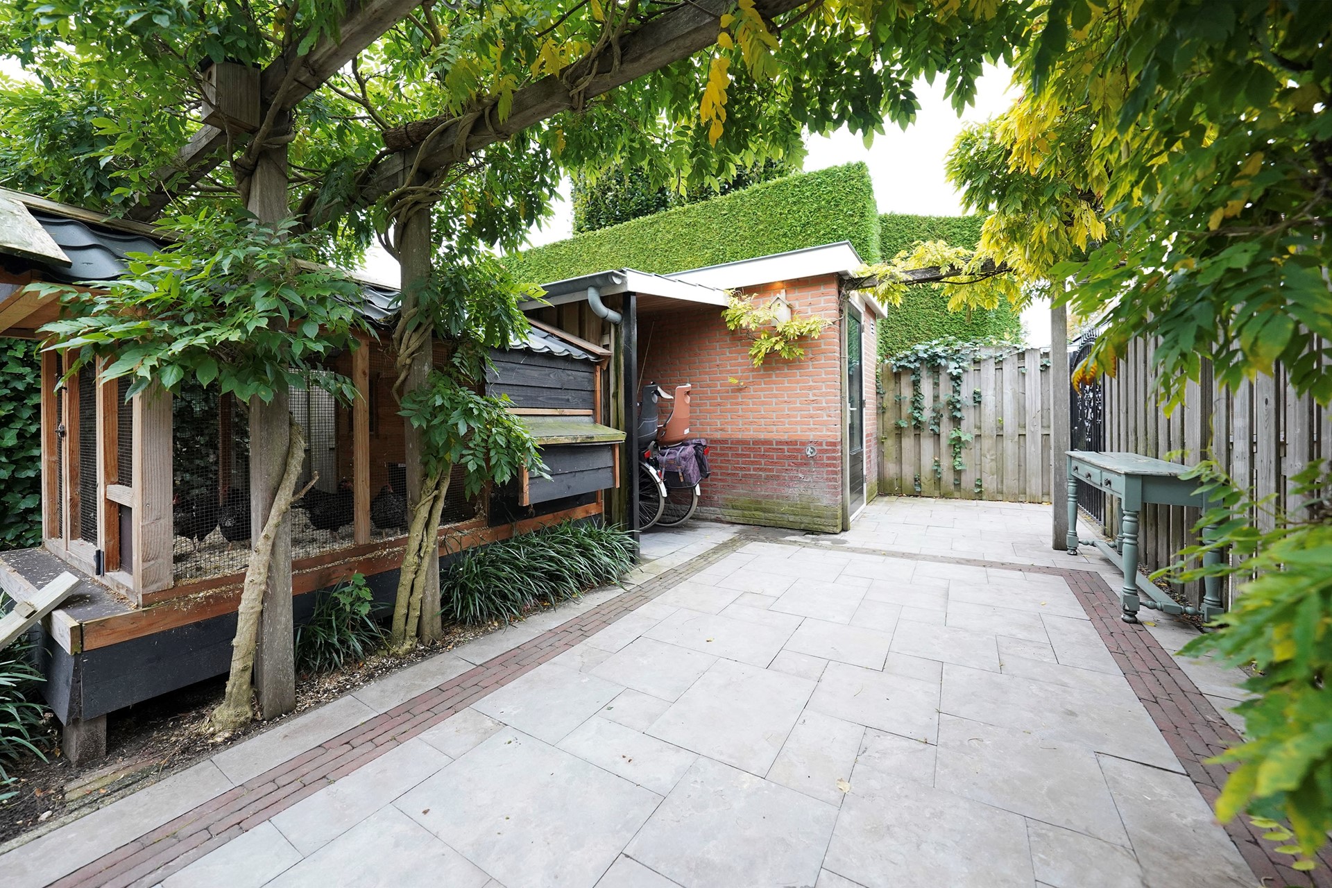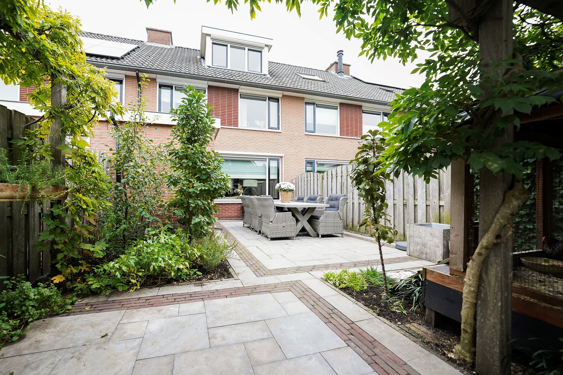Zoals al gezegd vind ik deze woningen altijd een hele vriendelijke, zonnige uitstraling hebben. Dit komt door de openheid van de erkers aan de voorzijde en de gekozen warme kleur steen. Bij aankomst valt mij meteen op dat ik een verzorgde woning binnenstap met sfeer en gezelligheid. De voordeur is voorzien van een overstek dus je kan lekker droog binnen stappen. De hal is goed van formaat waarbij linksom meteen de vernieuwde toiletruimte is gesitueerd met hangend toilet en mooie wastafel, afgewerkt met prachtige tegels. Via een deur met glas lopen we de living binnen waarbij de keuken aan de voorzijde is gelegen en de woonkamer aan de achterzijde. Een brede leefruimte met grote raampartijen! Door de uitgebouwde erker aan de voorzijde is de hoekkeuken echt ruim van opzet en daarbij voorzien van een hoog blad. Hier kan je fijn naar buiten. De keuken is al wat jaren oud maar heel leuk gepimpt en voorzien van nieuwe inbouwapparatuur. Aan de achterzijde van de woning is een uitbouw waar nu mooi plek is gemaakt voor de jassen en de schoenen. Slim! We lopen meteen even naar buiten want het is echt wel uniek hoe vrij je hier aan de achterzijde zit. De tuin is heel speels ingericht met zelfs een heel leuk kippenhok! (eventueel ter overname). De grote tafel met robuuste stoelen laten ook wel zien dat hier goed de ruimte voor is. De vrijstaande stenen berging is achterin de tuin gelegen en daar is een overkapping aangebouwd waar nu de fietsen gestald staan. Deze woning heeft precies geen achterpad waardoor de tuin nog dieper is. Leuk is het stalen sierhekwerk als achter toegang. De tuin is op het westen gelegen wat betekent dat je met name inde middag en avond heerlijk van het zonnetje kan genieten in de achtertuin.