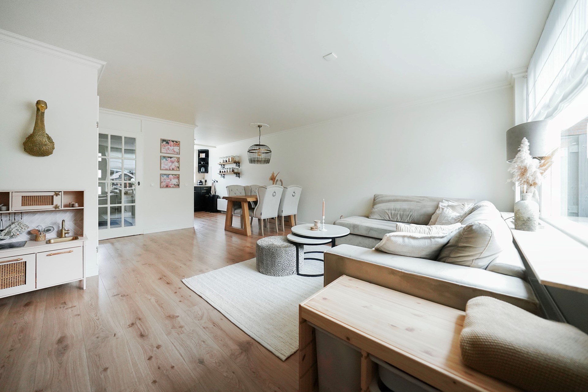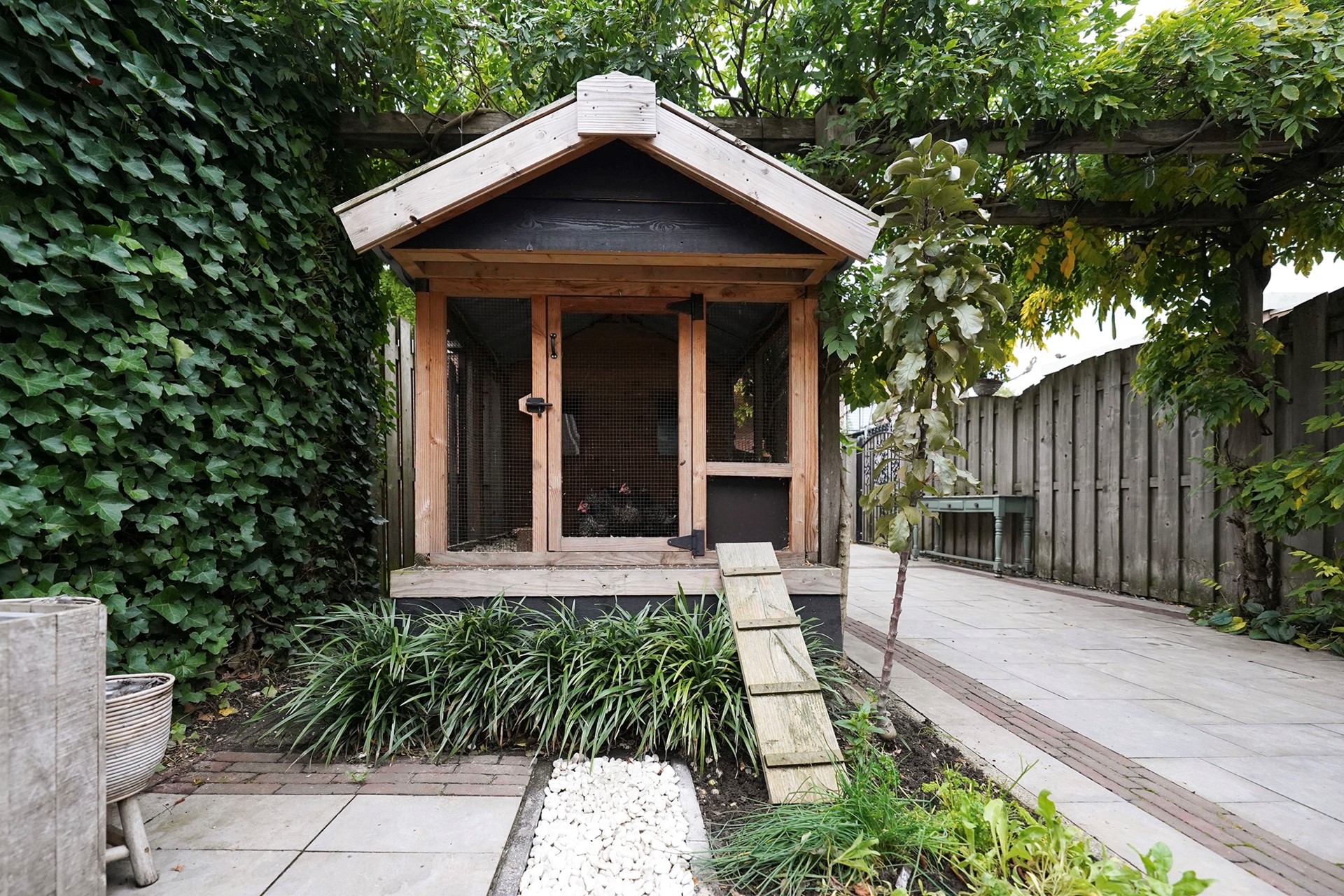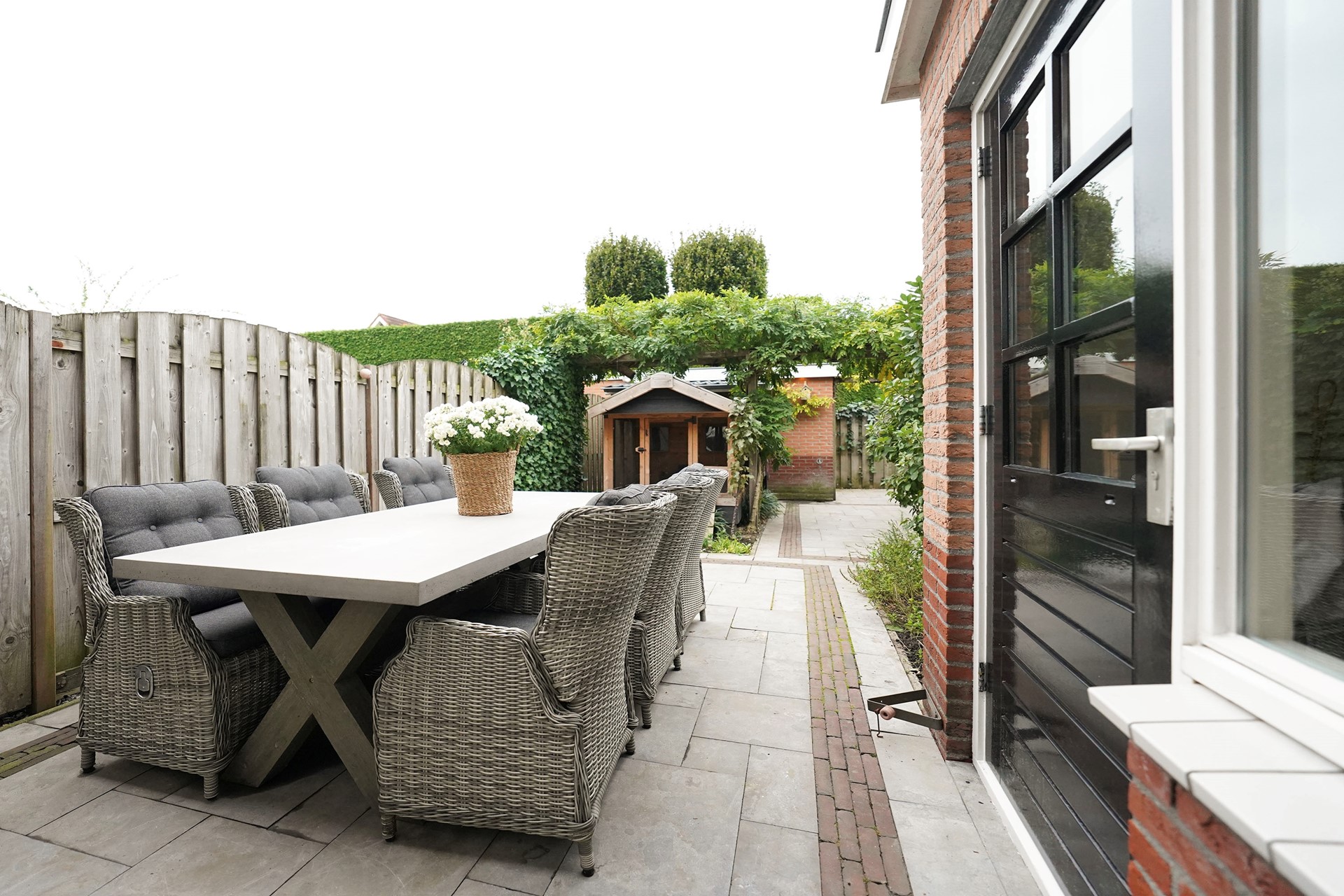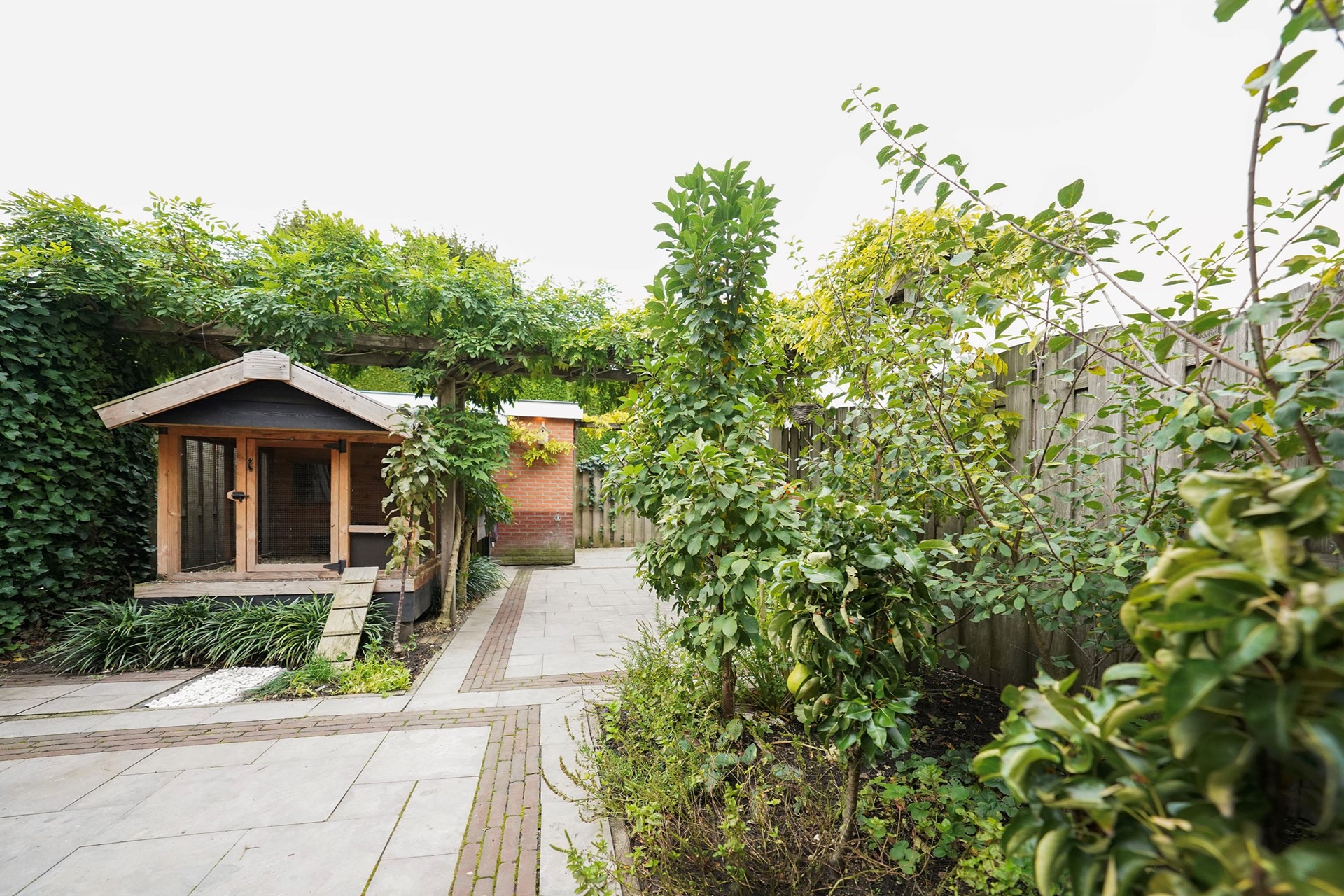 Zoals al gezegd vind ik deze woningen altijd een hele vriendelijke, zonnige uitstraling hebben. Dit komt door de openheid van de erkers aan de voorzijde en de gekozen warme kleur steen. Bij aankomst valt mij meteen op dat ik een verzorgde woning binnenstap met sfeer en gezelligheid. De voordeur is voorzien van een overstek dus je kan lekker droog binnen stappen. De hal is goed van formaat waarbij linksom meteen de vernieuwde toiletruimte is gesitueerd met hangend toilet en mooie wastafel, afgewerkt met prachtige tegels. Via een deur met glas lopen we de living binnen waarbij de keuken aan de voorzijde is gelegen en de woonkamer aan de achterzijde. Een brede leefruimte met grote raampartijen! Door de uitgebouwde erker aan de voorzijde is de hoekkeuken echt ruim van opzet en daarbij voorzien van een hoog blad. Hier kan je fijn naar buiten. De keuken is al wat jaren oud maar heel leuk gepimpt en voorzien van nieuwe inbouwapparatuur. Aan de achterzijde van de woning is een uitbouw waar nu mooi plek is gemaakt voor de jassen en de schoenen. Slim! We lopen meteen even naar buiten want het is echt wel uniek hoe vrij je hier aan de achterzijde zit. De tuin is heel speels ingericht met zelfs een heel leuk kippenhok! (eventueel ter overname). De grote tafel met robuuste stoelen laten ook wel zien dat hier goed de ruimte voor is. De vrijstaande stenen berging is achterin de tuin gelegen en daar is een overkapping aangebouwd waar nu de fietsen gestald staan. Deze woning heeft precies geen achterpad waardoor de tuin nog dieper is. Leuk is het stalen sierhekwerk als achter toegang. De tuin is op het westen gelegen wat betekent dat je met name inde middag en avond heerlijk van het zonnetje kan genieten in de achtertuin.