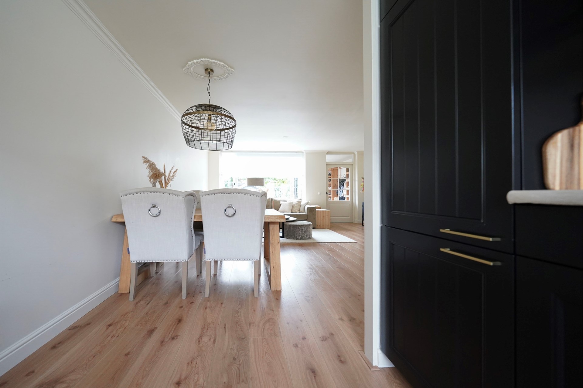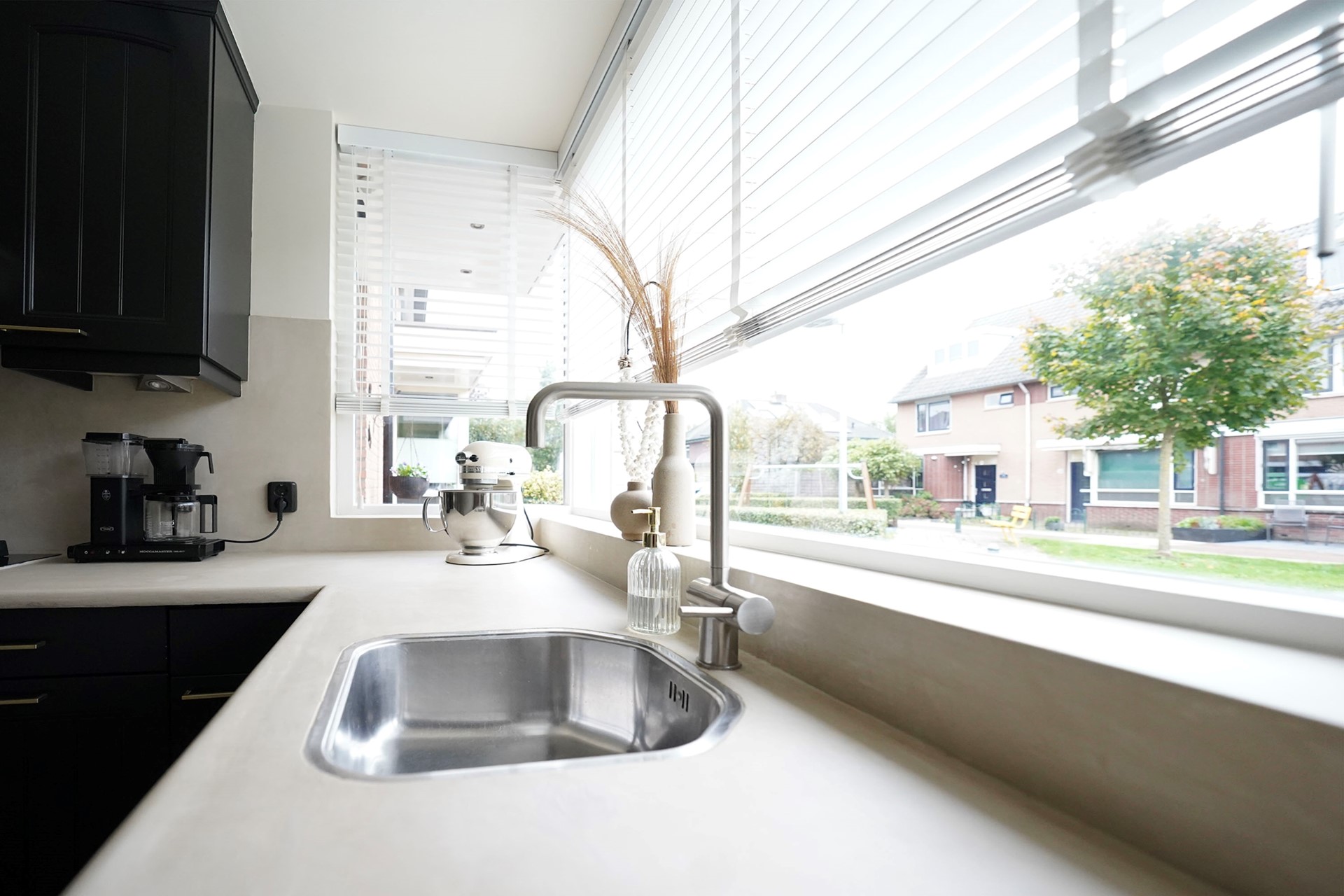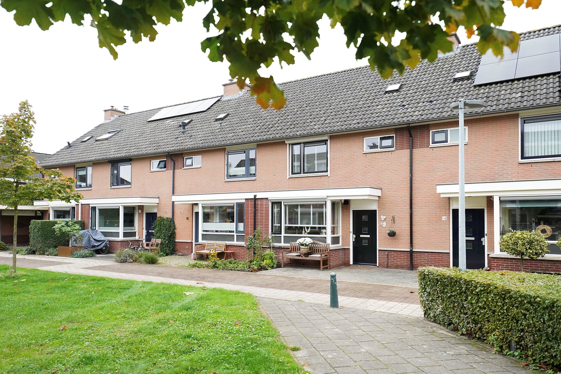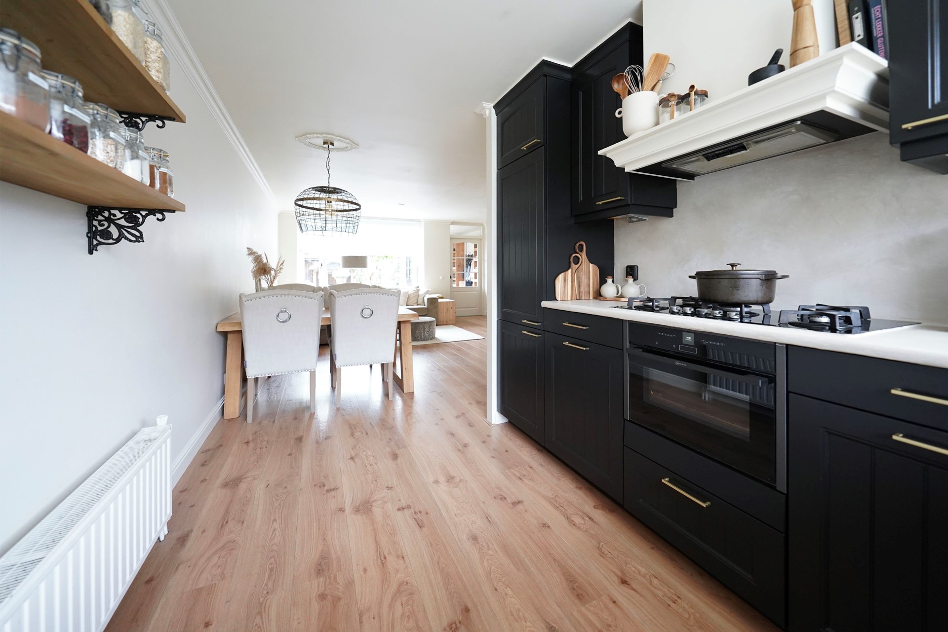 Zoals al gezegd vind ik deze woningen altijd een hele vriendelijke, zonnige uitstraling hebben. Dit komt door de openheid van de erkers aan de voorzijde en de gekozen warme kleur steen. Bij aankomst valt mij meteen op dat ik een verzorgde woning binnenstap met sfeer en gezelligheid. De voordeur is voorzien van een overstek dus je kan lekker droog binnen stappen. De hal is goed van formaat waarbij linksom meteen de vernieuwde toiletruimte is gesitueerd met hangend toilet en mooie wastafel, afgewerkt met prachtige tegels. Via een deur met glas lopen we de living binnen waarbij de keuken aan de voorzijde is gelegen en de woonkamer aan de achterzijde. Een brede leefruimte met grote raampartijen! Door de uitgebouwde erker aan de voorzijde is de hoekkeuken echt ruim van opzet en daarbij voorzien van een hoog blad. Hier kan je fijn naar buiten. De keuken is al wat jaren oud maar heel leuk gepimpt en voorzien van nieuwe inbouwapparatuur. Aan de achterzijde van de woning is een uitbouw waar nu mooi plek is gemaakt voor de jassen en de schoenen. Slim! We lopen meteen even naar buiten want het is echt wel uniek hoe vrij je hier aan de achterzijde zit. De tuin is heel speels ingericht met zelfs een heel leuk kippenhok! (eventueel ter overname). De grote tafel met robuuste stoelen laten ook wel zien dat hier goed de ruimte voor is. De vrijstaande stenen berging is achterin de tuin gelegen en daar is een overkapping aangebouwd waar nu de fietsen gestald staan. Deze woning heeft precies geen achterpad waardoor de tuin nog dieper is. Leuk is het stalen sierhekwerk als achter toegang. De tuin is op het westen gelegen wat betekent dat je met name inde middag en avond heerlijk van het zonnetje kan genieten in de achtertuin.