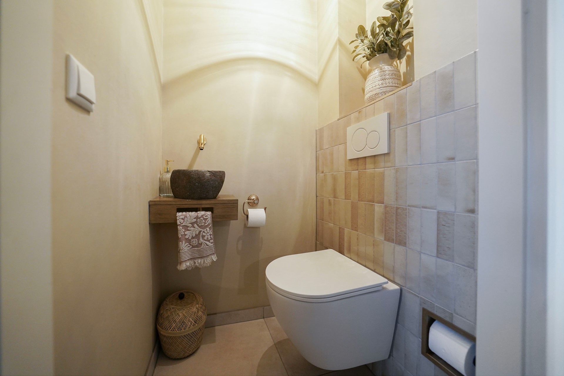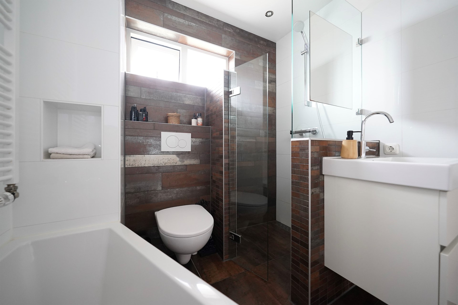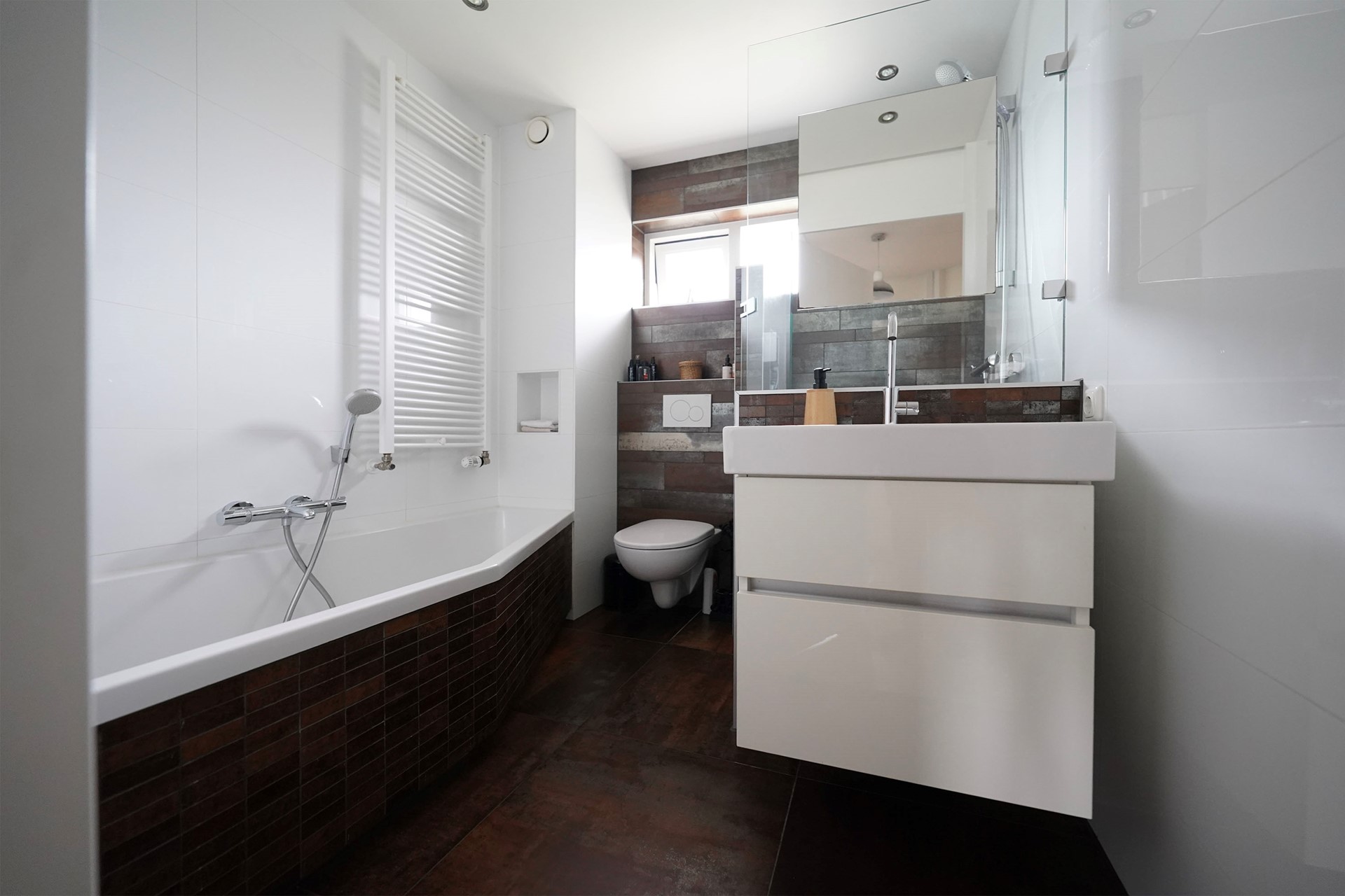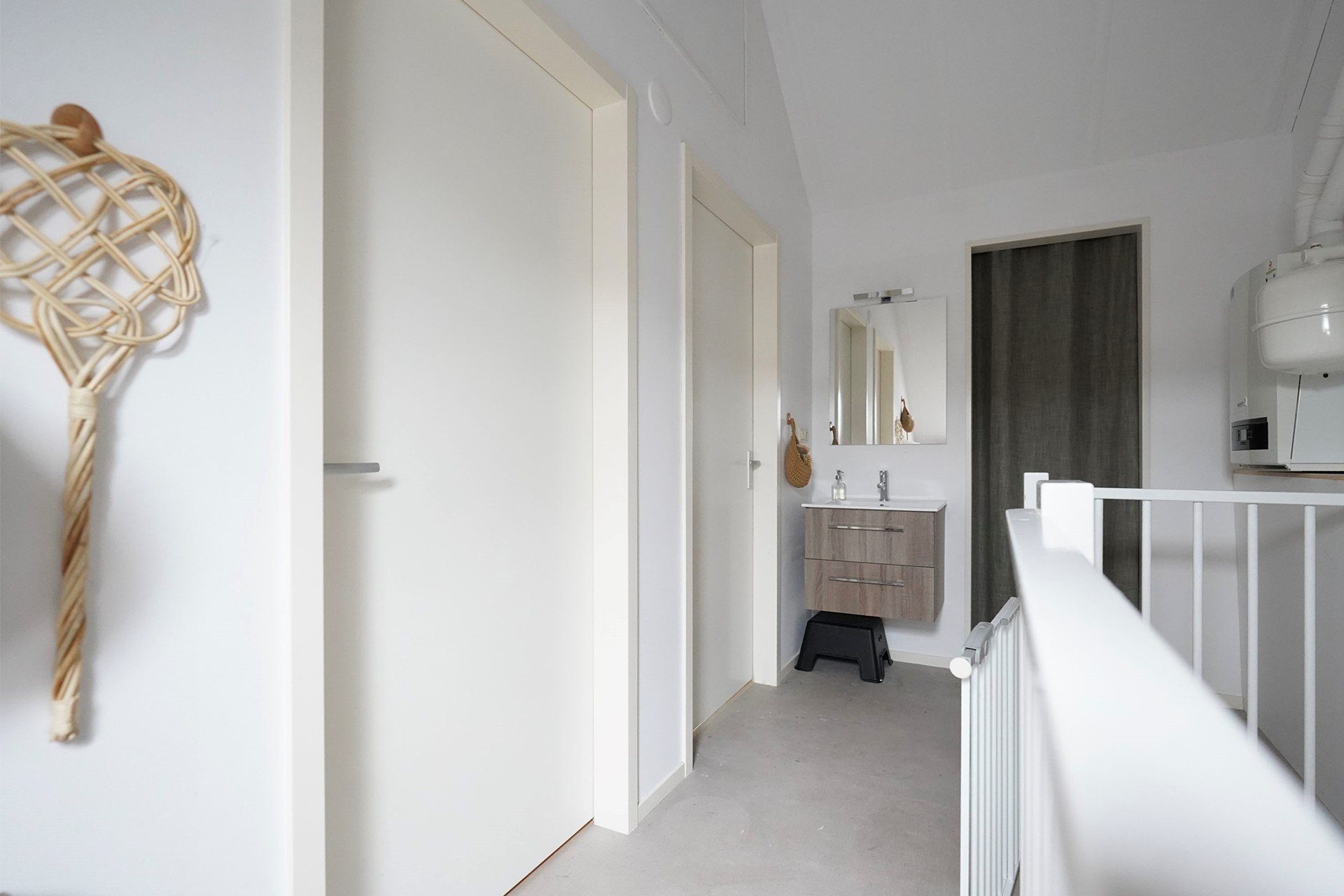 De overloop zelf is wel voorzien van een fijn dakraam en hier is ook de wasmachine en de droger gesitueerd.