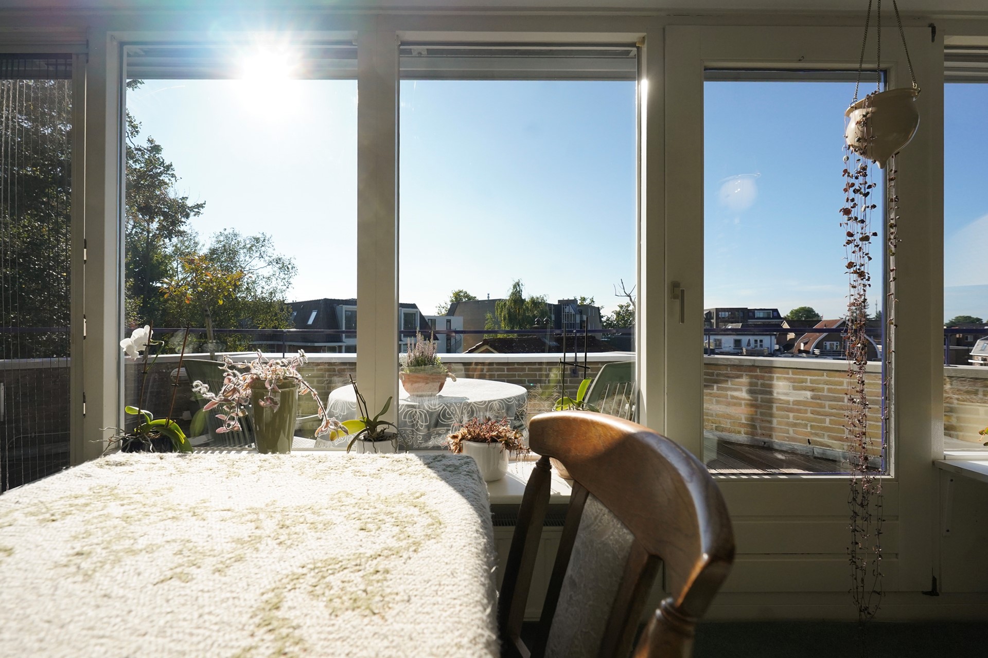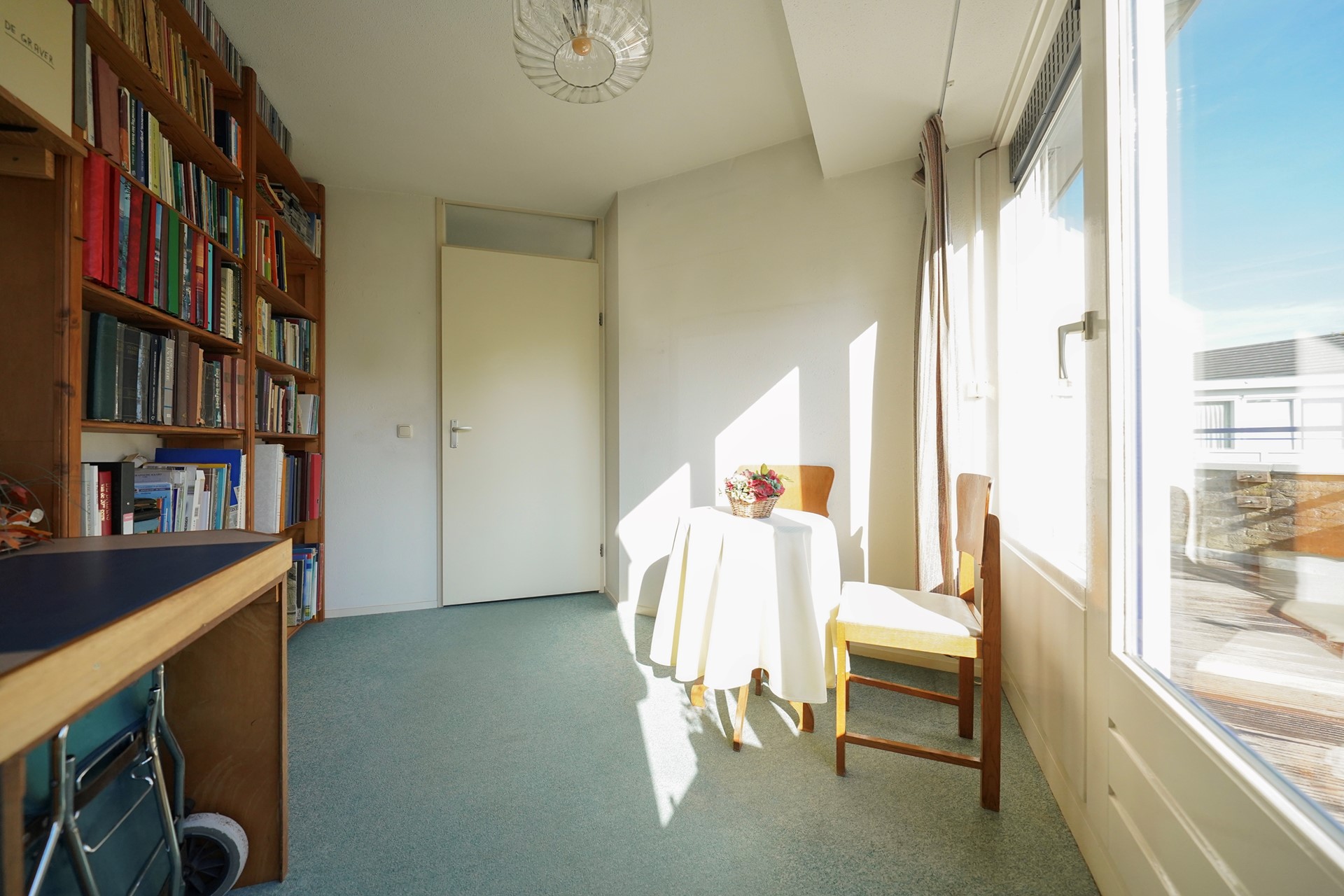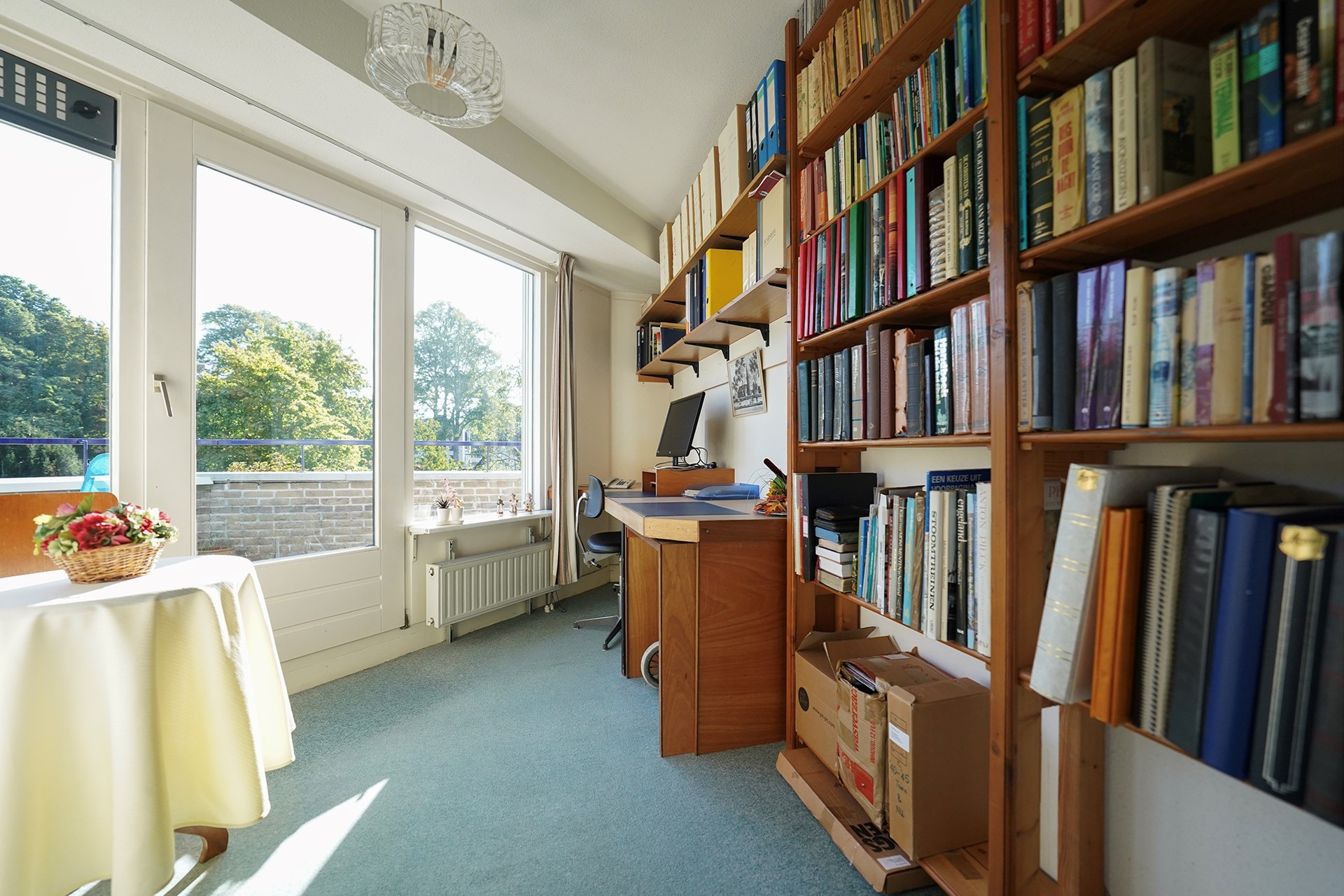 De 2e slaapkamer heeft ook een fors formaat en biedt toegang tot het terras op het oosten. De 3e kamer is ingericht als werkkamer op dit moment. Wat een sfeer en wat een heerlijke lichte kamer weer. Dan is er nog een ruime badkamer aanwezig met een douchecabine, een groot wastafelmeubel, een ligbad en een toilet. In de badkamer is ook ruimte voor een wasmachine en een droger. Er is daarnaast nog een separate toiletruimte met hangend toilet en fonteintje aanwezig.