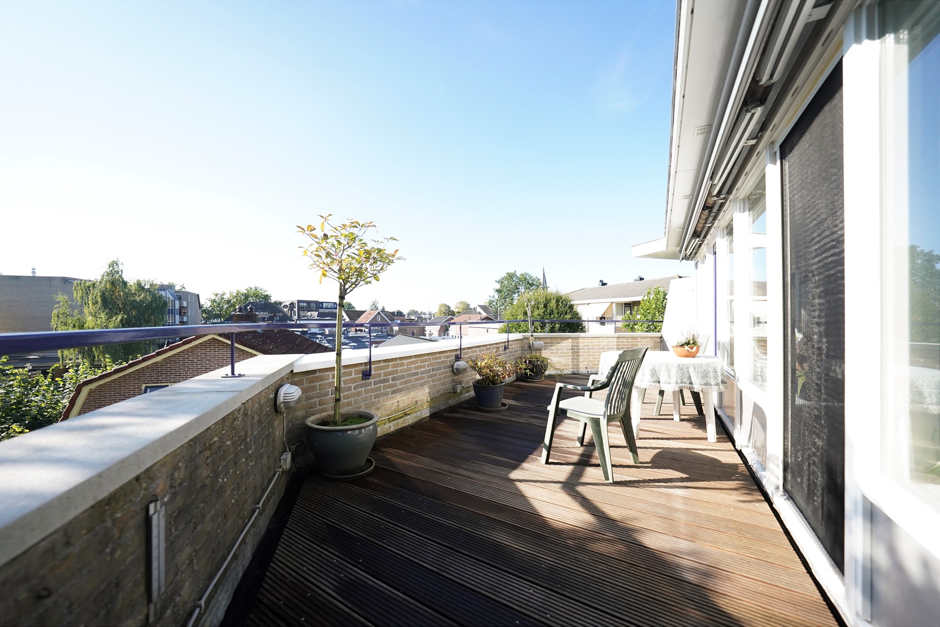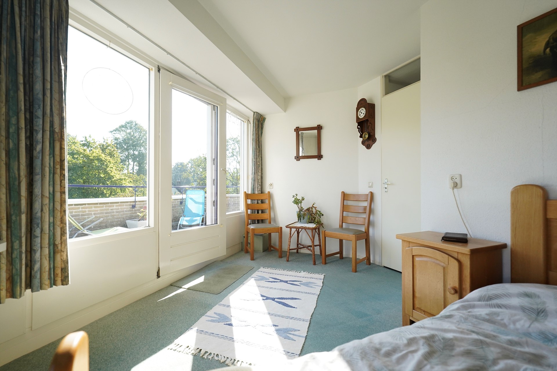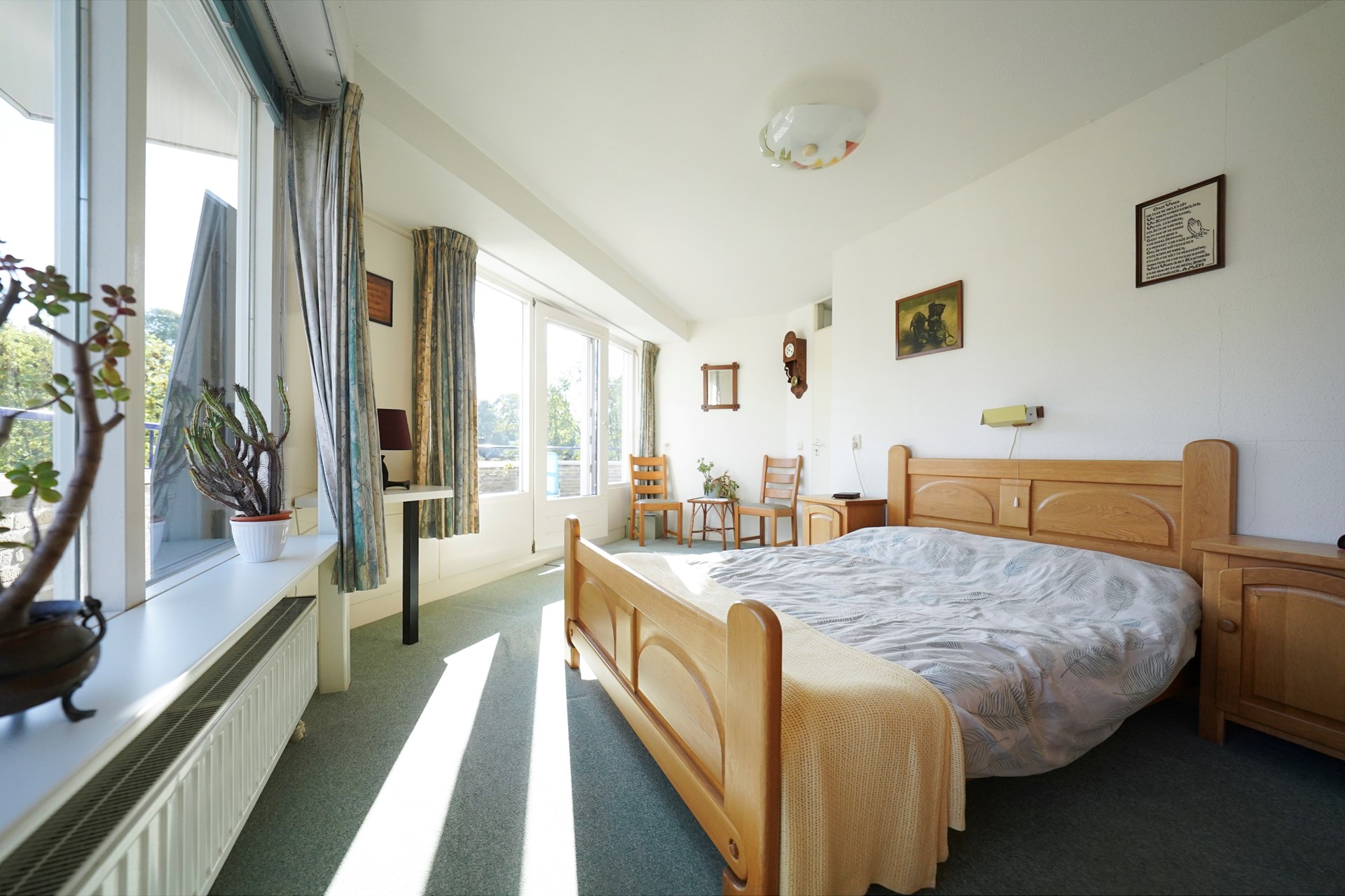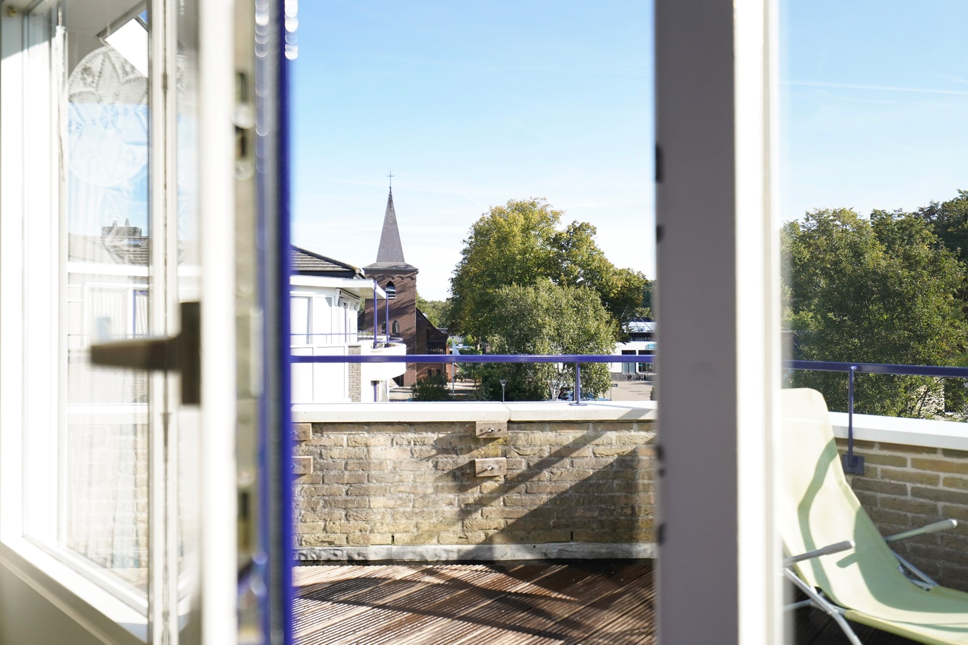 Weer terug naar de hal waar we nu aan de andere zijde de ouderslaapkamer betreden. Dit is ook weer een verrassende fijne, grote ruimte, juist meer op het noordoosten gelegen. Ook hier bevindt zich een deur naar het terras en vanaf deze zijde heeft u uitzicht op de Katholieke kerk aan de Brinkstraat. De straat is wat verder weg gelegen, dus het is rustig vertoeven op het terras. Prachtig zijn de bomen op de oostkant waardoor u ook wat schaduw heeft, maar vooral lekker groen uitzicht. Ook al woont u op de bovenste verdieping, hier kunt u ook genieten van de natuur!