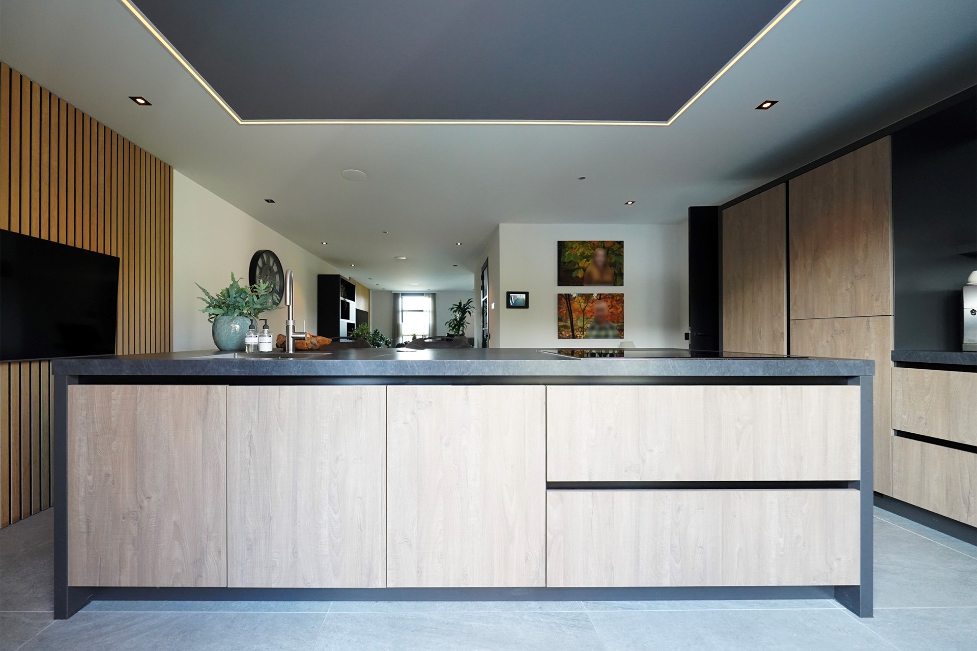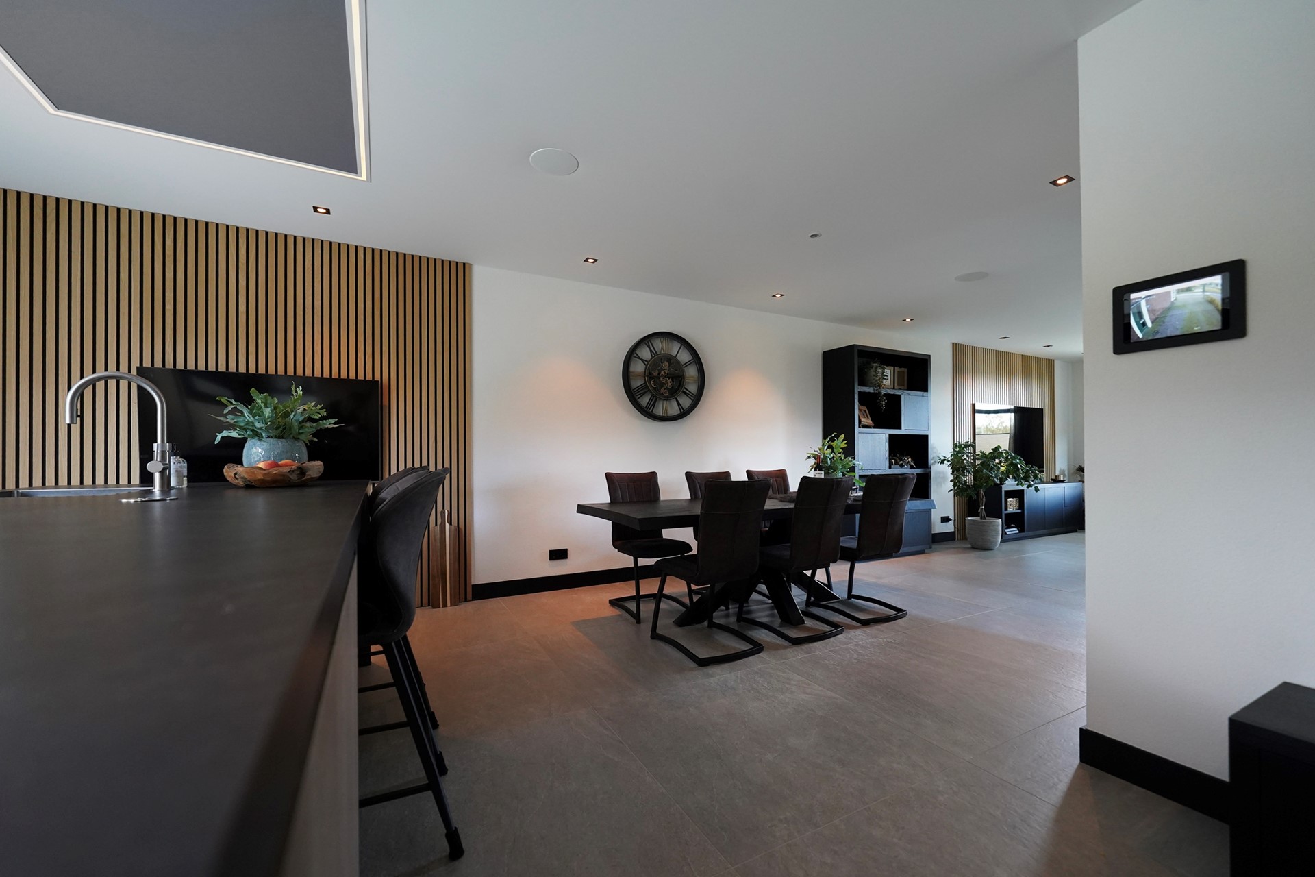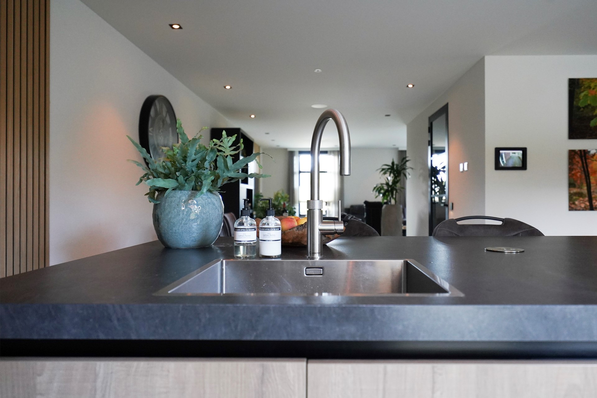 Bij aankomst valt mij meteen die vrije ligging op waarbij de woning op een hoek gelegen is en je volledige privacy hebt. Heel fijn! We kunnen ruim parkeren op eigen terrein en als ik dat eenmaal gedaan heb en de woning bekijk valt het me nu pas op hoe hoog deze woningen zijn. Ik kan je vertellen dat de woning zelfs 4 verdiepingen heeft! De uitstraling van de woning vind ik prachtig met mooi metselwerk, een gebroken kap en gebruik van goede kleuren. De hoofdentree is aan de zijgevel gesitueerd en ook de aanbouw heeft een eigen entree aan deze zijgevel. Praktisch! Ik kom binnen in een goede hal waarbij me meteen opvalt dat de afwerking van de trap en de deuren matzwart zijn afgewerkt. Geen standaard witte nieuwbouwdeuren dus! De uitstraling is meteen heel chique en het gebruik van de mooie grote tegels op de vloer versterken deze uitstraling. Meteen links is de toiletruimte gesitueerd. Bij binnenkomst gaat de verlichting automatisch aan en uiteraard is deze ruimte voorzien van een hangend toilet en een fonteintje. We lopen door naar de living en de woonkeuken waarbij deze 2 ruimtes van elkaar gescheiden zijn door de hal in het midden. De meeste ideale indeling als je het mij vraagt. Bij binnenkomst valt meteen op wat een heerlijke ruimtes het zijn. De woonkamer is aan de voorzijde gelegen en heeft het vrije uitzicht over de straat, de wadi en de stationsstraat. Het hoekraam is daarbij een mooie eyecatcher. Het plafond is volledig voorzien van een spanplafond waardoor de akoestiek ook perfect is in de woonkamer en de keuken. De keuken is ook echt een eyecatcher. Zo’n eiland is de droom van iedere huizenbezitter denk ik. En wat voor een eiland! Aan werkruimte geen gebrek en de vaste kastenwand is daarbij ook echt ideaal. Bijna de volledige achtergevel is voorzien van glas en via de openslaande tuindeuren loop je zo de tuin in.