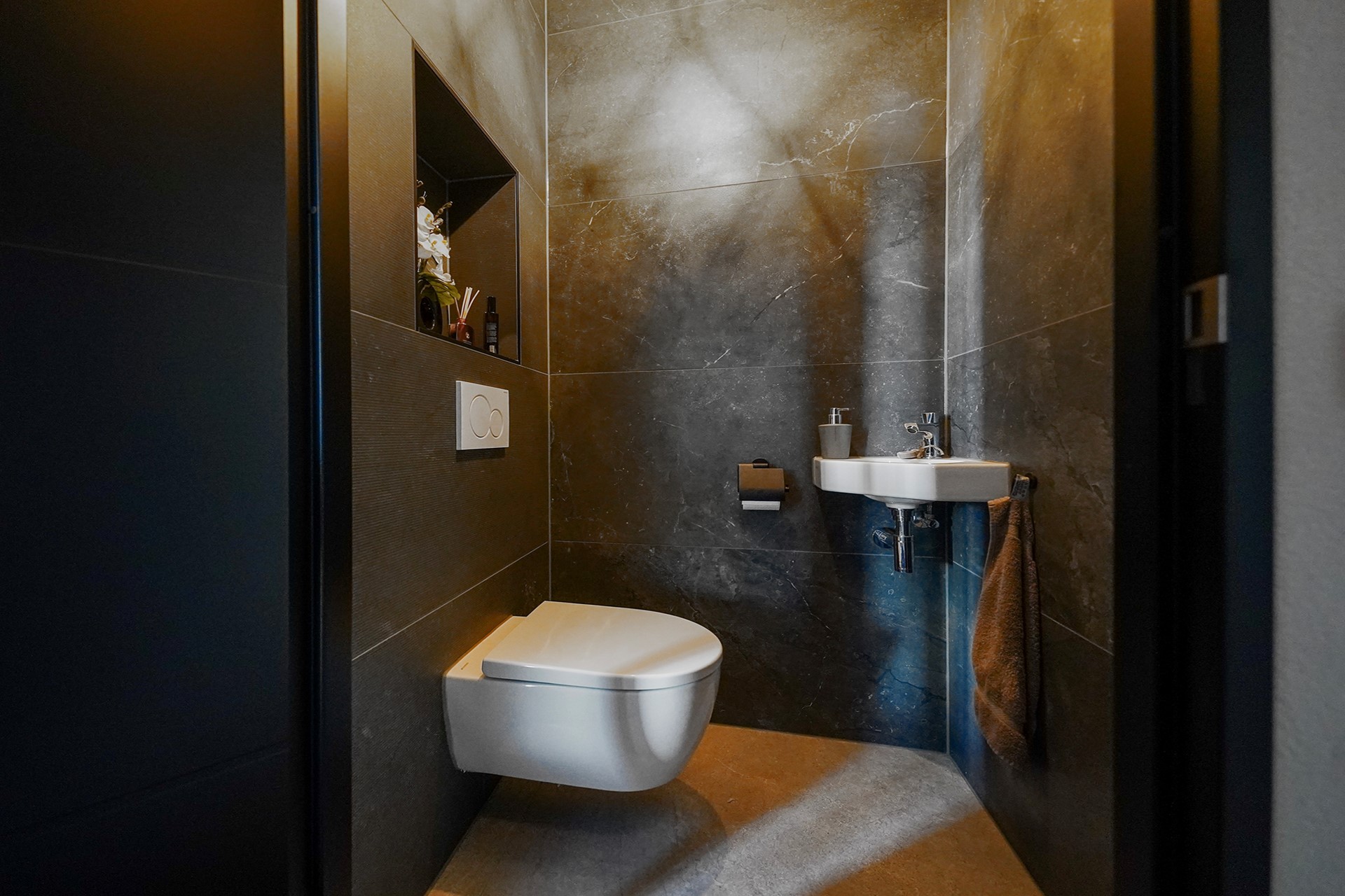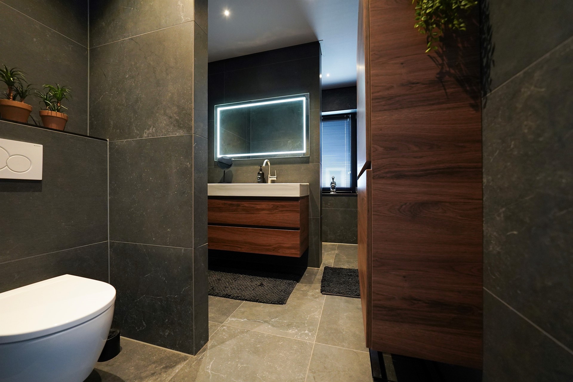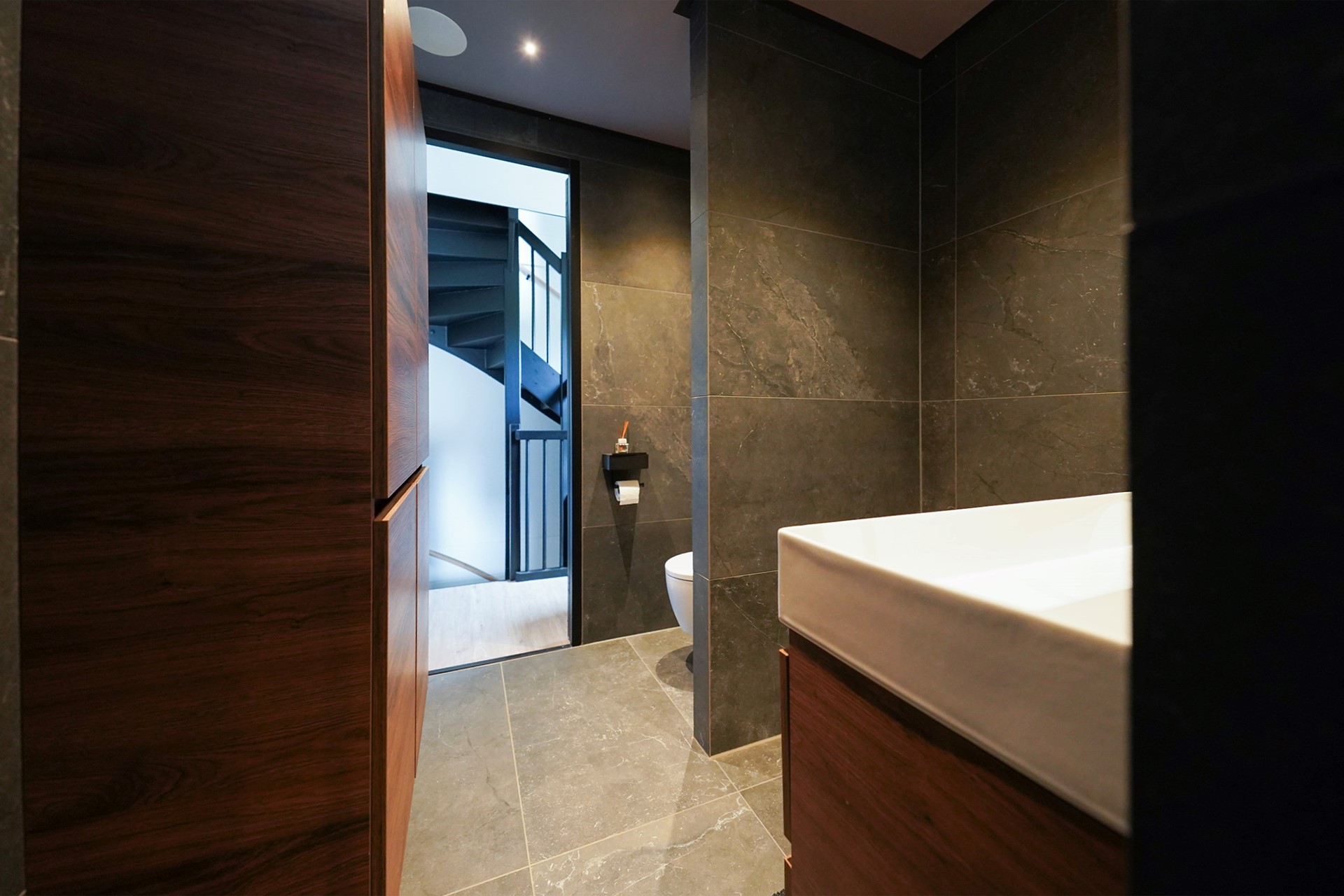 Bij aankomst valt mij meteen die vrije ligging op waarbij de woning op een hoek gelegen is en je volledige privacy hebt. Heel fijn! We kunnen ruim parkeren op eigen terrein en als ik dat eenmaal gedaan heb en de woning bekijk valt het me nu pas op hoe hoog deze woningen zijn. Ik kan je vertellen dat de woning zelfs 4 verdiepingen heeft! De uitstraling van de woning vind ik prachtig met mooi metselwerk, een gebroken kap en gebruik van goede kleuren. De hoofdentree is aan de zijgevel gesitueerd en ook de aanbouw heeft een eigen entree aan deze zijgevel. Praktisch! Ik kom binnen in een goede hal waarbij me meteen opvalt dat de afwerking van de trap en de deuren matzwart zijn afgewerkt. Geen standaard witte nieuwbouwdeuren dus! De uitstraling is meteen heel chique en het gebruik van de mooie grote tegels op de vloer versterken deze uitstraling. Meteen links is de toiletruimte gesitueerd. Bij binnenkomst gaat de verlichting automatisch aan en uiteraard is deze ruimte voorzien van een hangend toilet en een fonteintje. We lopen door naar de living en de woonkeuken waarbij deze 2 ruimtes van elkaar gescheiden zijn door de hal in het midden. De meeste ideale indeling als je het mij vraagt. Bij binnenkomst valt meteen op wat een heerlijke ruimtes het zijn. De woonkamer is aan de voorzijde gelegen en heeft het vrije uitzicht over de straat, de wadi en de stationsstraat. Het hoekraam is daarbij een mooie eyecatcher. Het plafond is volledig voorzien van een spanplafond waardoor de akoestiek ook perfect is in de woonkamer en de keuken. De keuken is ook echt een eyecatcher. Zo’n eiland is de droom van iedere huizenbezitter denk ik. En wat voor een eiland! Aan werkruimte geen gebrek en de vaste kastenwand is daarbij ook echt ideaal. Bijna de volledige achtergevel is voorzien van glas en via de openslaande tuindeuren loop je zo de tuin in.