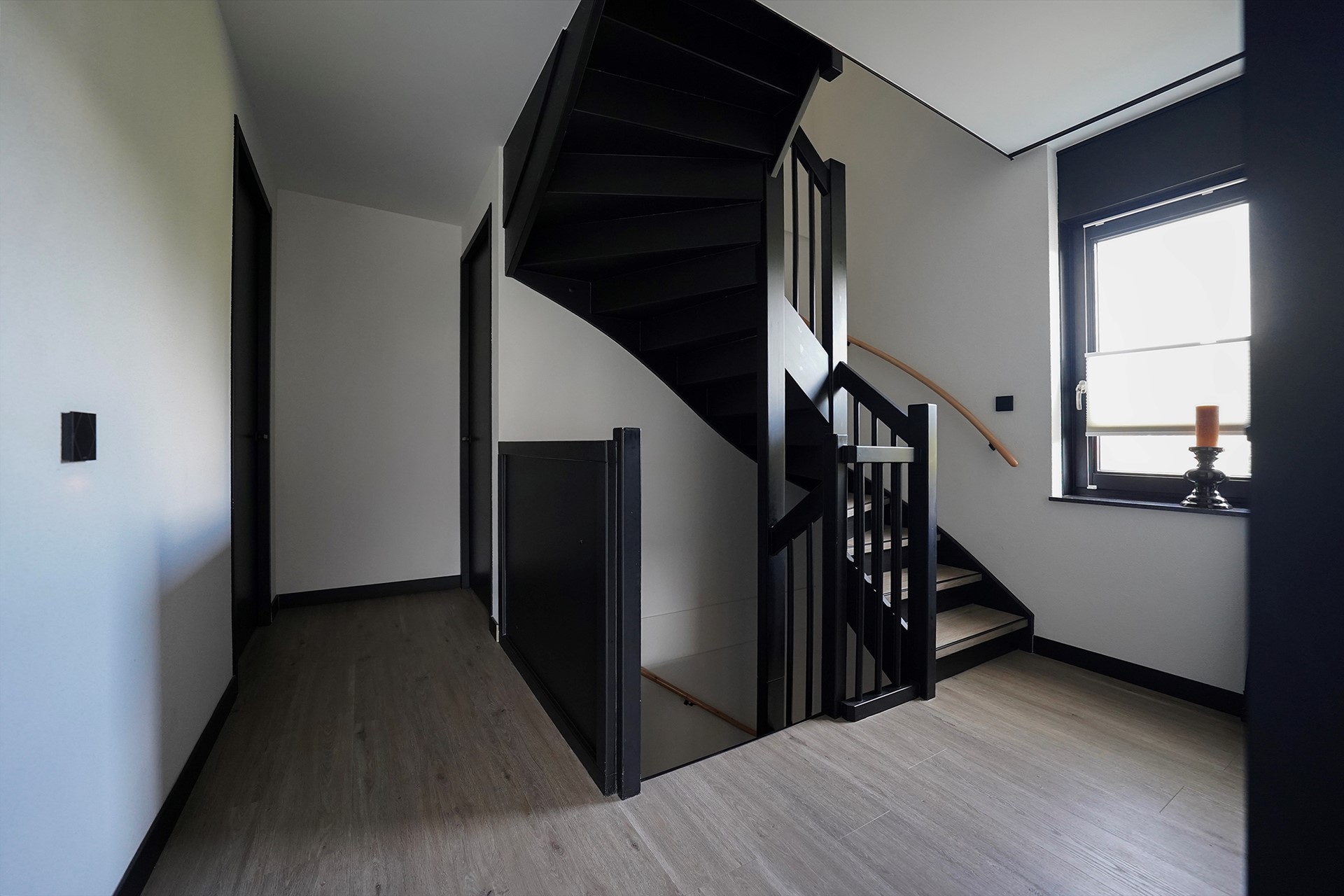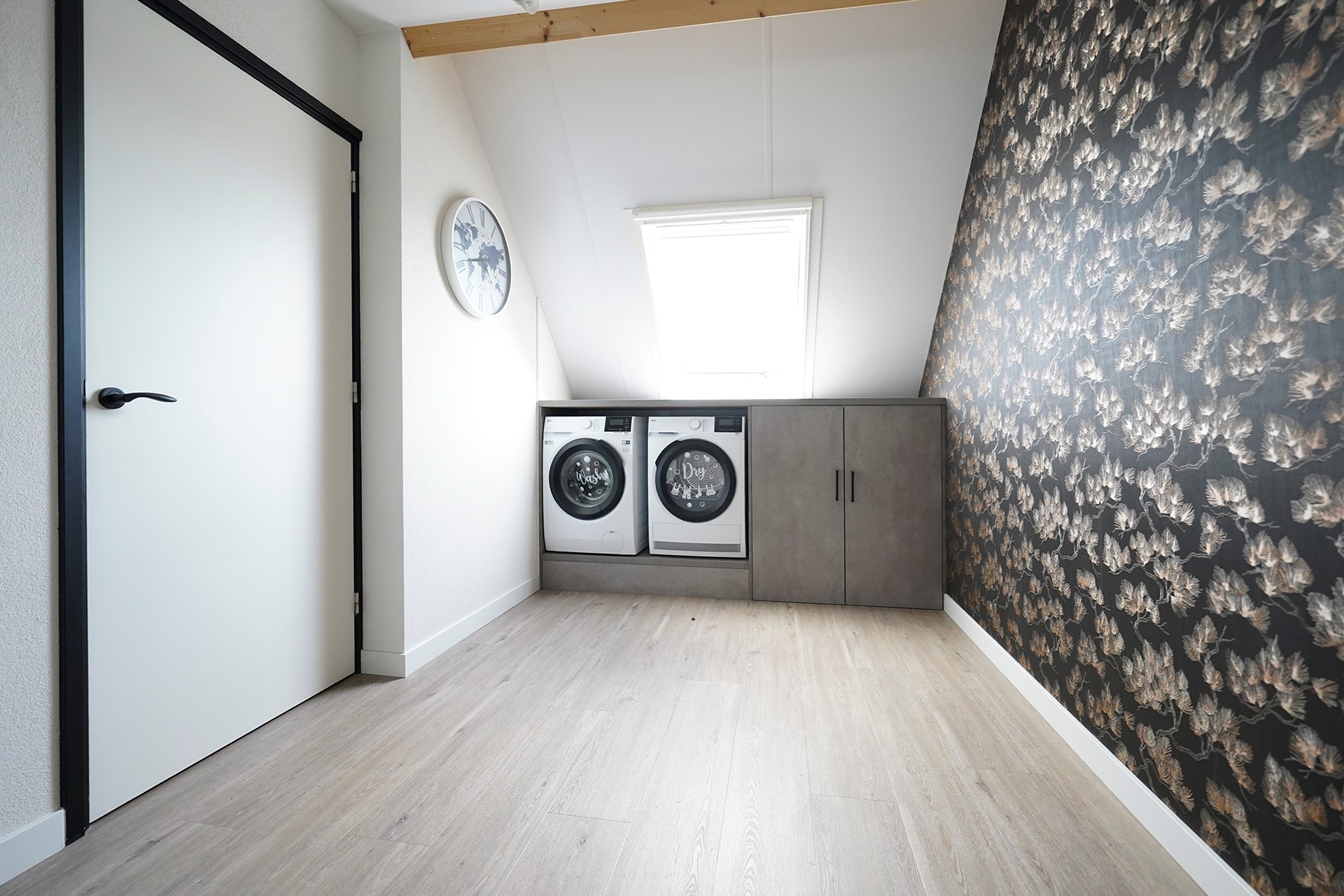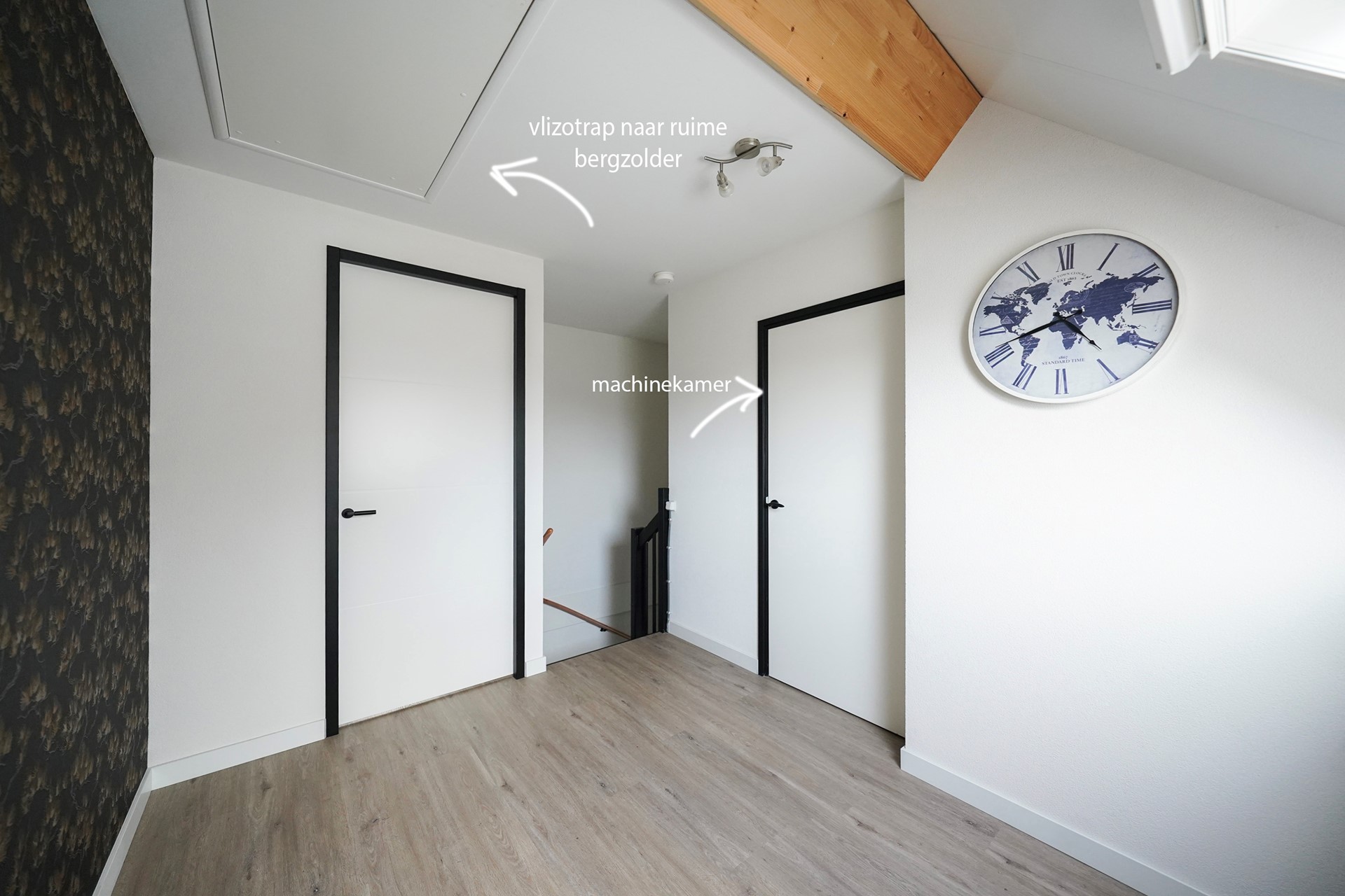 Weer via een mooie zwarte trap gaan we door naar een volwaardige 2e verdieping met ontzettend veel ruimte. Hier bevindt zich een ruime overloop waar ook de wasmachine en droger, netjes ingebouwd, zijn gesitueerd. Ook is er een enorm grote 4e slaapkamer aanwezig tevens voorzien van een inloopkast. Verder is er een machinekamer waar alle installaties zoals de warmtepomp en de boiler zijn geplaatst en zo ook fijn uit het zicht zijn.